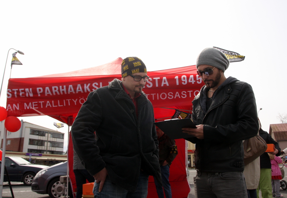 Akaan Toijalassa oli Vapunpäivänä perinteinen vappumarssi ja sen jälkeen toritapahtuma, marssille osallistuimme ammattiosaston lipulla jota puheenjohtaja kantoi ja airuiena toimi sihteeri ja taloudenhoitaja, lisäksi osastomme Metallin Vaikuttajat ryhmä kulki oman viirinsä ja airuiden kanssa. Tämän johdosta ammattiosastostamme oli enemmän marssijoita, kuin muista Akaan liittojen ammattiosastoista yhteensä. Tämä osoittaa tietysti osastomme aktiivisuutta, mutta myös on valitettavaa, ettei muiden alojen liput juuri enää marssilla näy. Rakennusliitto on pitänyt paikallisen osastonsa voimin marssiperinnettä yllä. Torille osastomme oli Maijalan Antin johdolla pystyttänyt kojun Vakiduunikampanjan tiimoilta, tarkoituksena kerätä nimiä kansalaisaloitteeseen. Väkeä kojun ympärillä hyöri mukavasti ja nimiäkin saatin lyhyen tapahtuman aikana mukavasti. Eli n.70 allekirjottajaa, tätä kirjoittaessani on kansalaisaloitteen vaadittu minimitavoite jo saavutettu. Jaettavana ollutta kotimaista riisisuklaavalmistetta jäi vielä syötäväksi osastomme kokouksiinkin. Torilla ja tien varrella oli mukavasti väkeä, orkesteri nosti tunnelmaa. Jarno Palanderin avauspuhe sai lyhyenä ja ytimekkäänä ansaitsemansa tunnustuksen. Pääpuhujana toiminut Sanni Halla-aho käsitteli laajasti juuri käytyjä vaaleja ja yhteiskunnallista tilannetta. Lapsille suunnattu ohjelmakin täytti tehtävänsä ja jäätelökojulla oli kova myynti. Hyvä keväinen vapputapahtuma, voisi todeta. |