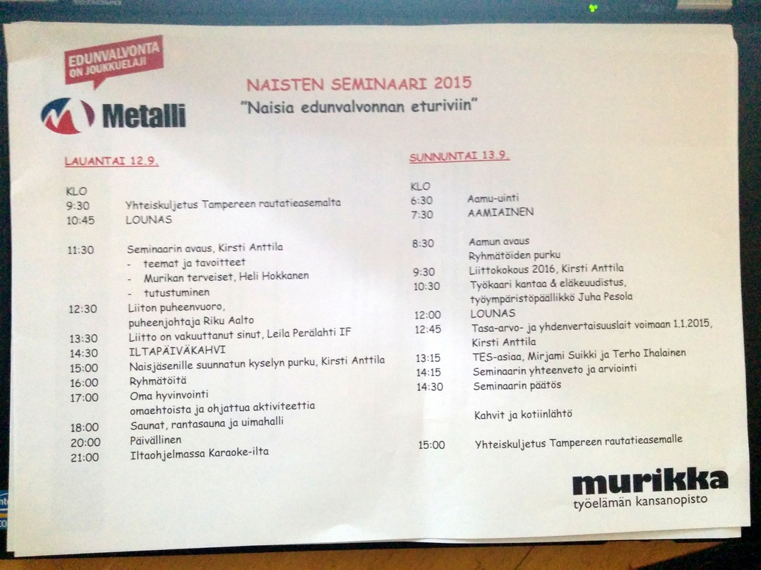 Naisia edunvalvonnan eturiviin Murikka opisto 12-13.9.2015 Kaikille työssäkäyville ja työttömille metallin naisjäsenille avoin. Liiton puheenvuoro Pj Riku Aalto Työkaari kantaa, työympäristöpäällikkö Juha Pesola Liittokokousasiaa kulttuurisihteeri Kirsti Anttila TES asiaa Mirjami Suikki ja Terho ihalainen, sopimusasiantuntjoita molemmat.